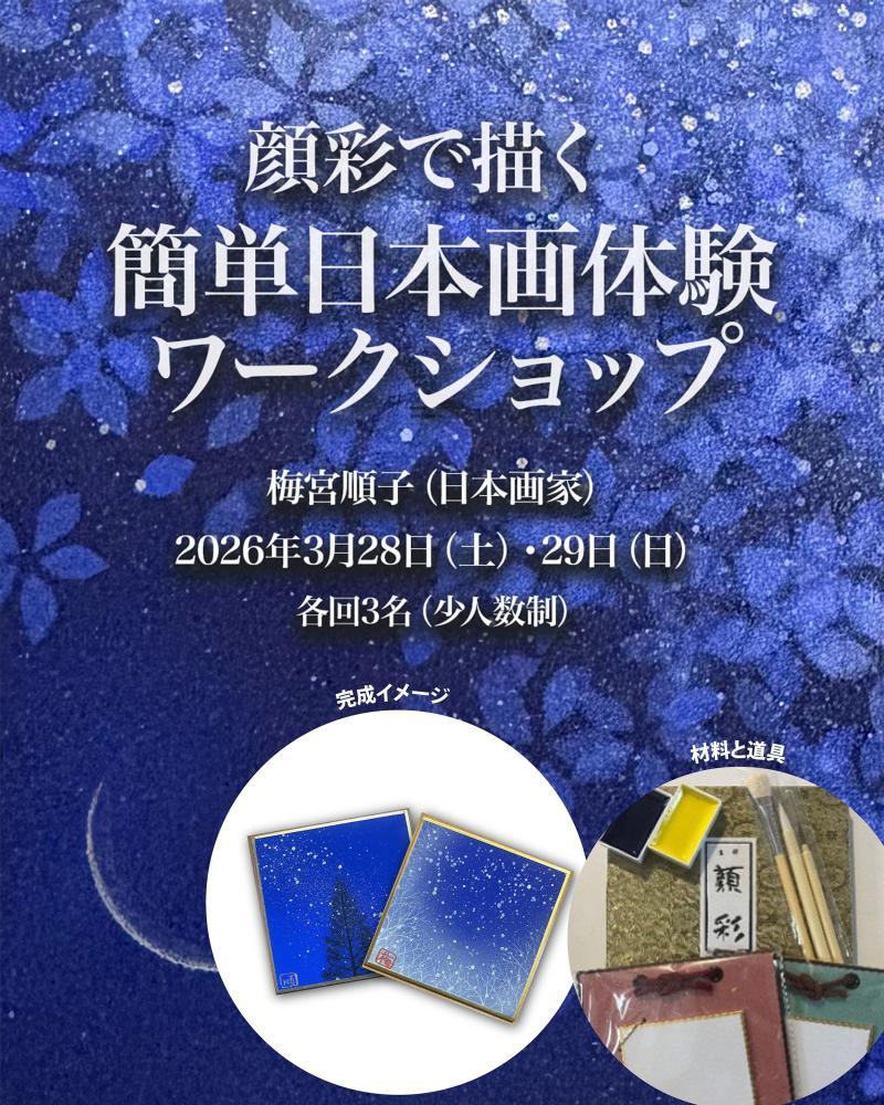 日本画家・梅宮順子による、日本画ワークショップを開催します。日本画絵具「顔彩」を使用し、豆色紙に作品を制作します。色を重ねることで生まれる滲みや広がりを楽しみながら、一点ずつ仕上げていきます。