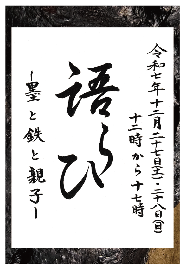 本展「語らひ ― 墨と鉄と親子 ―」では、 書と金属という異なる素材を扱う “親と子” の作品を同一空間で構成します。