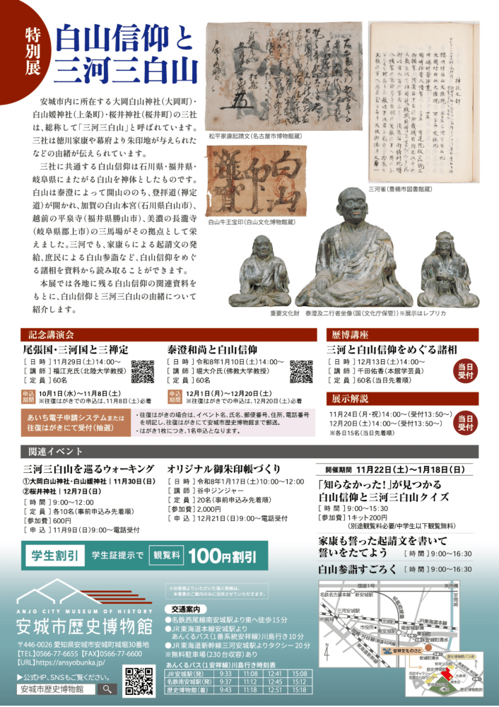三社に共通する白山信仰は石川県・福井県・岐阜県にまたがる白山を神体としたものです。白山は泰澄によって開山ののち、登山道が開かれ、加賀の白山本宮(石川県白山市)、越前の平泉寺(福井県勝山市)、美濃の長瀧寺(岐阜県郡上市)の三馬場がその拠点として栄えました。三河でも、家康らによる起請文の発給、庶民による白山参詣など、白山信仰をめぐる諸相を文書から読み取ることができます。