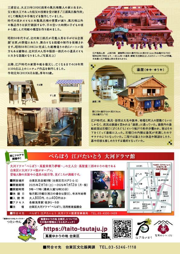 浅草出身の檜細工師 三浦宏が手掛けた江戸期の家屋のミニチュア作品を展示しています。